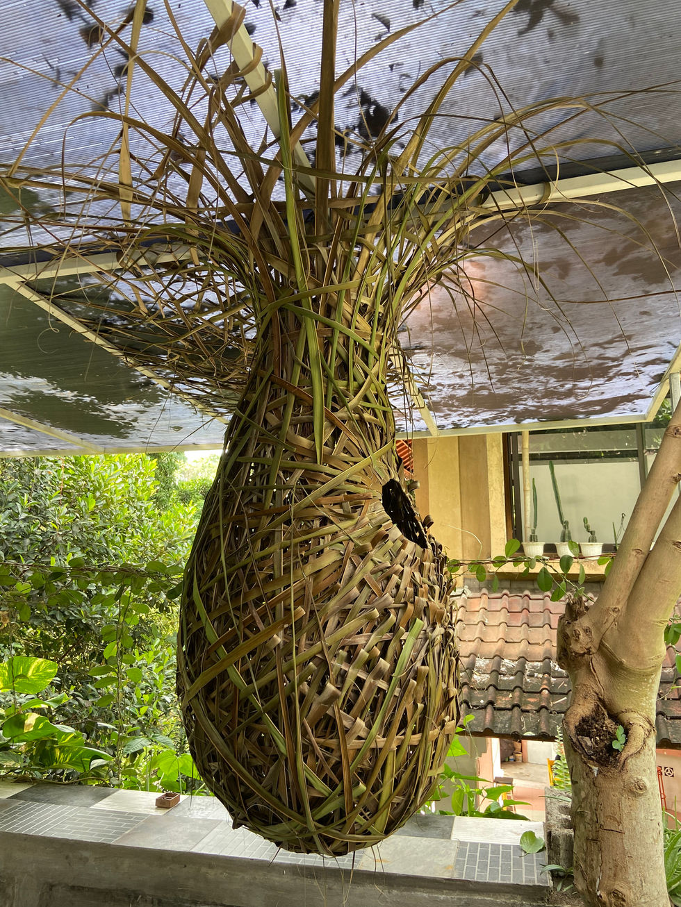 In its form, the object refers to a shelter, a home, a protective shell, or a nest. It grows slowly and does not seek to stand out; it longs to blend into the local environment. It would like to be part of this world, yet despite its camouflage it remains foreign – like an invasive plant. Too large, too different, unidentifiable. However, it does not want to remain inaccessible or closed off in its own bubble – it opens itself to the world and to the possibility of glimpsing its interior. It is made from local natural materials, from coconut leaves that are an inseparable part of local life. It is flexible and resilient, though not forever. During my stay it endures, browning and drying, until, much like myself, it leaves behind only a negligible trace.